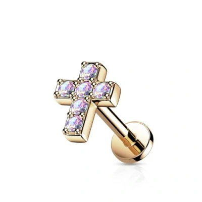 PiercedOff Gold Tone 316L Surgical Steel Labret with Clear CZ Cross Length 6mm Width 1.2mm