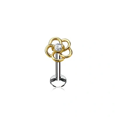 PiercedOff Gold Tone 316L Surgical Steel Labret with Hollowed Flower and Clear CZ Gem Length 6mm Width 1.2mm