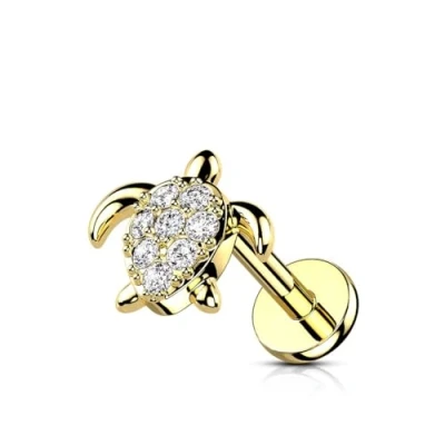 PiercedOff Gold Tone 316L Surgical Steel Labret with Paved Clear CZ Turtle Length 6mm Width 1.2mm