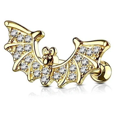 PiercedOff Gold Tone IP over 316L Surgical Steel Cartilage Barbell with CZ Paved Bat Wings Thickness 16GA (1.2mm) / Length 6mm Ball Size 3mm 15mm