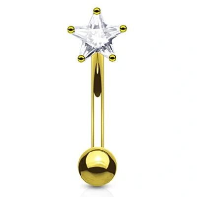 PiercedOff Gold Tone IP over 316L Surgical Steel Curved Barbell with Externally Threadead 3mm Star Shaped Clear CZ Ball Thickness 16GA (1.2mm) / Length 8mm Size