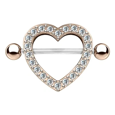PiercedOff Rose Gold Tone IP over 316L Surgical Steel Nipple Shield with Clear CZ Gem Paved Heart Thickness 14GA (1.6mm) / Length 22mm Ball Size 5mm