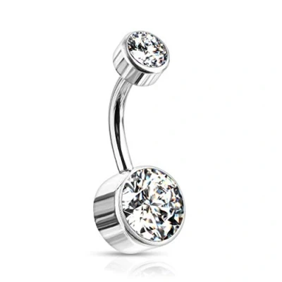 Thickness 14GA (1.6mm) Length 10 mm Ball size 4 x 6mm Simple but not Boring. This curved barbell navel ring belly bar is made from solid Grade 23 implant grade titanium . The 4mm top and 6mm bottom ends feature the highest quality crystals. Internally threaded for super comfortable insertion and removal. This navel ring belly bar will add colour and glamour to your piercing. Elegance in a single package!