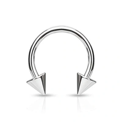 Thickness 14GA (1.6mm) Length 10 mm Spike Size 4x4mm Made from solid Grade 23 implant grade titanium, and has externally threaded with spikes. This horseshoe jewellery works beautifully in multiple piercings including eyebrow and septum as well as cartilage piercings including the rook, daith, helix, tragus, and more
