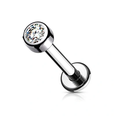 Thickness 16GA (1.2mm) Length 8 mm A bold and multi-purpose internally threaded labret stud. The 8mm post is made from solid Grade 23 implant grade titanium, and is internally threaded with a Bezel Set round 3mm clear cubic zirconia gem. This jewellery works well in multiple piercings including the labret and monroe as well as cartilage piercings like the tragus, helix, conch, and more. This cartilage stud body jewellery has it all!