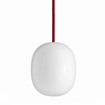 Super-egg 300 Opal/Red Cable has a height of 30 cm and a diameter of 25 cm, making it the largest of the three sizes. The simple pendant is often seen in smaller groups of 2-3 differently sized lamps, or in a straight line where they contribute to a neat and sophisticated expression.