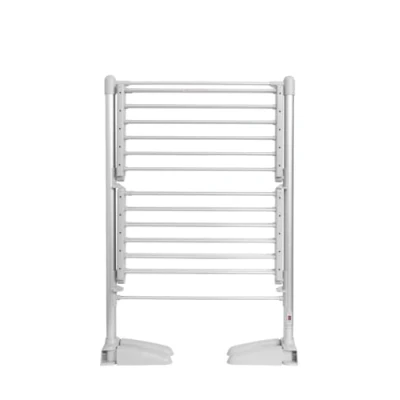 DUAL-TIER DESIGN: Features 24 heated drying tubes across 2 tiers, providing ample space for multiple items whilst maintaining a compact footprint LOADING CAPACITY: Sturdy construction supports up to 20kg of wet laundry, with stable support legs ensuring reliable performance during use VERSATILE STORAGE: Includes 2 mesh shelves and 2 peg hangers for various drying needs, plus a heat cover to enhance drying efficiency ENERGY EFFICIENT: 200W power consumption provides cost-effective drying, with 1.8 metre power cord for flexible positioning SPACE-SAVING: Convenient foldable design allows for flat storage when not in use, perfect for homes with limited space