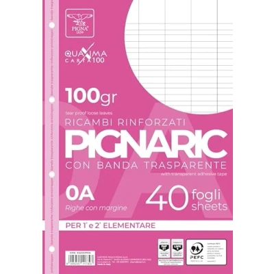 Pigna 02222370A, Replacement with Reinforced Band, Rigatura 0A, Rows for 1st and 2nd Grade, Paper 100 g/m², Pack of 40 Sheets