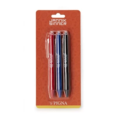 Set of 3 erasable pens Jannik Sinner by Pigna Red, black and blue ink, with rubber Jannik Sinner was born in San Candido (BZ) on August 16, 2001. He began playing tennis at the age of 7, and from 8 to 12 he was also a young ski champion. His specialty was the giant slalom. He launched the Instagram series "What's Kept You Moving", in which he discusses delicate themes together with sportsmen and famous people – the Italian Olympic champion sprinter Filippo Tortu and Paralympic champion Bebe Vio among others. His best shot is the reverse, he loves hard surfaces, his favorite tournament is the US Open and the city where he likes to play the most is Rome. Despite his young age, he is already one of the best players in the world.