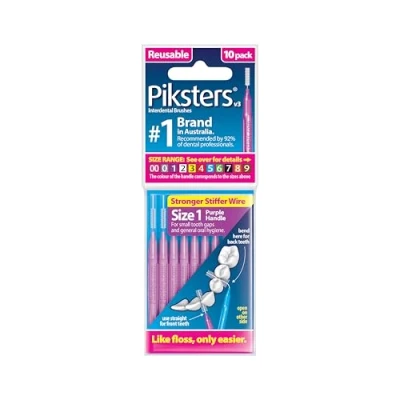 Durable and Reusable: Crafted with strong, stiff, plastic-coated wire, these interdental brushes resist buckling and bending, allowing for multiple uses and providing excellent value. Innovative Connector Cap: Each brush comes with a connector cap that doubles as an extension handle, providing enhanced control and ease of use. This feature is particularly beneficial for reaching back teeth and ensuring comprehensive cleaning. Compact and Travel-Friendly Design: Resealable 10pk, making it perfect for maintaining oral hygiene on the go. Its compact size fits conveniently into bags or luggage, ensuring you can care for your teeth wherever you are. Ideal for Daily Maintenance: Regular use of Piksters Interdental Brushes promotes healthy teeth and gums by effectively cleaning areas that standard toothbrushes may miss, helping to prevent gum disease and tooth decay.