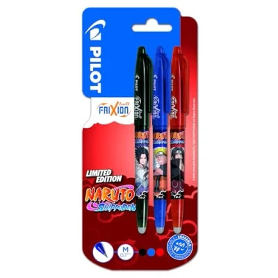 Limited Edition Pilot FriXion x NARUTO SHIPPUDEN: dive into the world of Naruto Shippuden with our new collaboration; inspired by the iconic characters, our limited-edition pens offer an captivating design; collect them now and join the fan community The FriXion erasable pen reinvents the way you write; thanks to its optimal technology, write, erase and rewrite instantly without the slightest trace or crossing out; no more wasted paper, no more torn pages, with FriXion pens, your writing is always optimal Smooth and Precise Writing: the FriXion Ball and FriXion Ball Clicker 0.7 offer a medium-sized writing, optimal for all your note-taking, homework and homework activities; its drop- and shock-resistant tip guarantees smooth and smudge-free writing, for impeccable results every time Ultra Practical 2-in-1 Erasable Pen: don't waste any more time starting your writing from the beginning; with FriXion, erase your mistakes in an instant, without leaving any traces; get neat work and save precious time; take your erasable rollerball with you everywhere thanks to its practical clip, to attach to your notebooks, sheets and diaries This Pack Contains: 3 erasable FriXion Ball 0.7 rollerball pens in black, blue and red with the characters Naruto, Sasuke and Itachi. 2002 MASASHI KISHIMOTO / 2007 SHIPPUDEN All Rights Reserved