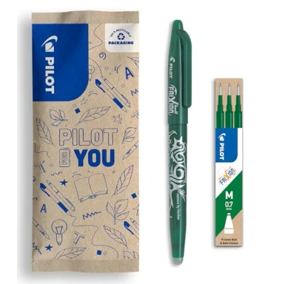 PILOT set of 1 Frixion Ball + 3 refills Erasable pen with heat sensitive ink Refillable rollerball made from recycled plastic Green Medium tip