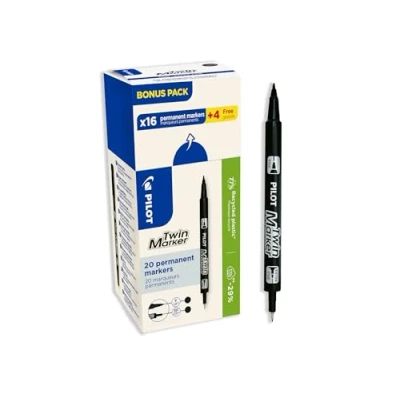2-IN-1 DOUBLE TIP MARKER: Dual tip marker (fine 0.5mm and extra-fine 0.45mm) allows you to switch between precision and thicker line to suit all your writing and marking needs in one pen MULTI-SURFACE PERMANENT INK: oil-based ink, free from xylene or toxic solvents, suitable for all media (paper, plastic, metal, glass, ceramics, etc.) QUICK DRYING & HIGH STRENGTH - Quick-drying ink designed to limit smudging, water and light resistant, suitable for long lasting and professional use DESIGNED WITH 76% RECYCLED PLASTIC - Made from recycled materials (excluding consumables), this pen is part of the PILOT Begreen range Package contents: This pack contains 20 black twin markers. Convenient cap and lightweight body for comfortable and durable grip