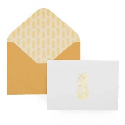 ELEGANT DESIGN: Each notecard features a charming gold-foil pineapple motif. PREMIUM QUALITY: Beautifully printed on thick, high-quality card stock for a luxurious writing experience. BOXED SET OF 12: Includes 12 notecards and 12 coordinating yellow envelopes with a stylish patterned lining, neatly presented in a gift box with acetate lid. BLANK INSIDE: Left blank for your own personal message, making the cards ideal for thank you notes, invitations, or everyday correspondence. PERFECT GIFT: A thoughtful stationery gift for friends, family, or colleagues.
