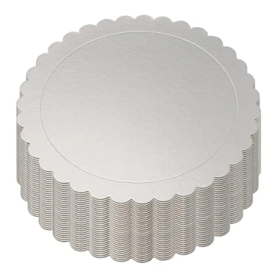 PRACTICAL MATERIAL - This round cake boards are made of corrugated cardboard, laminated to ensure a firm and stable cake base, not easy to deform or break, which can sturdily support a variety of cakes and pastries without worrying about the cake collapsing. WHAT YOU GET - A set of 30 scalloped cake boards, each 8 inches in diameter and up to 2 millimetres thicker than other cardboard cake pans, strong enough to withstand varying weights of cake and ensure your baking creations remain intact. EASY TO USE - Not only does the 1400gm cardboard cake base board easily support your cake while remaining lightweight and portable, it also makes it easy to move the finished product to a display tray or cake box, providing you with extra convenience. VERSATILE APPLICATIONS - The small circle cake board is perfect for serving a variety of flavours of cakes, fruits, pizzas and homemade desserts at birthdays, weddings, business dinners or other events, making it an ideal choice for professional bakers and home bakers alike. EXQUISITE APPEARANCE - There lace design on the bottom of the silver cake board round looks more sophisticated and adds a unique and stylish element to the overall design, injecting more artistry into your baking creations and making them more attractive to display and serve.