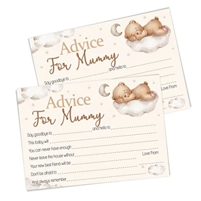 🧸 LOVELY KEEPSAKE ACTIVITY - Guests can share their wise words for the expectant mother during the baby shower. Collect the cards and store them in an envelope or box (not included). After the baby is born, the mother can open the envelope/box and enjoy reading through them. These charming cards make a special keepsake for the new mum. 🧸 A PERFECT SIZE - These delightful cards are size A6 (measuring 10.5 x 14.8 cm / 4.1 x 5.8") These are the perfect size for keeping in an album, memory box or scrap book. 🧸 10 CARDS INCLUDED - This pack includes 10 cards for guests to fill in ready for Mummy to enjoy later on. 🧸 READY TO USE - No set up is needed for this activity, simply hand out the cards to each guest or if you are in a restuarant lay one at each place setting then you are ready to go! 🧸 SUITABLE FOR BABY SHOWERS AND GENDER REVEALS - A perfect addition to your baby shower but also great for gender reveal parties. As these are sentimental cards to keep, they are not something you would want to do at both your Baby Shower and your Gender Reveal, we would recommend having them for one or the other. 🧸 TEDDY BEAR THEMED - This baby shower game boasts a cute teddy bear design that will make your heart melt. The theme features a sleepy bear floating on a cloud, with a color scheme of beige, cream, and brown, perfect for your Teddy themed Baby Shower! ❤️ 100% BRITISH MANUFACTURED - We source all of our materials from paper to package, here on our sunny little island Great Britain. Shop local & support British businesses!