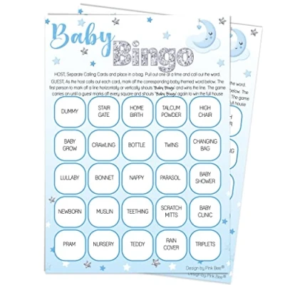 🌜 EASY TO PLAY - Get ready for a baby shower twist with this unique Bingo game! Instead of crossing off numbers, listen for baby and pregnancy related words like 'Dummy' and 'Nappy'. The pre-filled bingo cards come with perforated calling cards that can easily be torn off and placed in the bag for the caller. 🌜 A PERFECT SIZE - These Over The Moon Bingo cards are 12.5cm x 17.5cm (7in x 5in) in size. They're bigger than your average bingo cards, as most games on the market are only A6 size, which is about the size of a postcard. Perfect for a better view of the game! 🌜 UP TO 20 PLAYERS - With 20 Bingo cards included everyone can join in on the fun. Also included are 60 calling cards so be ready for 'the line' then the 'full house' 🌜 READY TO PLAY - Prepare for a stress-free game of Baby Bingo with our pre-filled sheets and perforated calling cards. Just divide them, drop them in a bag/tub, and they're good to go! All you need is a pen and get ready for some eyes down fun! 🌜 SUITABLE FOR BABY SHOWERS AND GENDER REVEALS -SUITABLE FOR BABY SHOWERS AND GENDER REVEALS - A perfect addition to your baby shower but also great for gender reveal parties, this game sets the tone for a fun and interactive event. Get ready for some laughs and competition with this unique addition to your celebration. 🌜 OVER THE MOON THEME - Transform your baby shower into a dreamy celebration with our 'Over the Moon' range! Featuring a serene sleepy moon on a cloud with shimmering silver stars, in delicate pastel baby blue and white hues. This charming collection is perfect for Over the Moon, Twinkle, Twinkle Little Star or Sweet Dreams theme Baby Showers ❤️ 100% BRITISH MANUFACTURED - We source all of our materials from paper to package, here on our sunny little island Great Britain. Shop local & support British businesses!, Manufacturer: Pink Bee