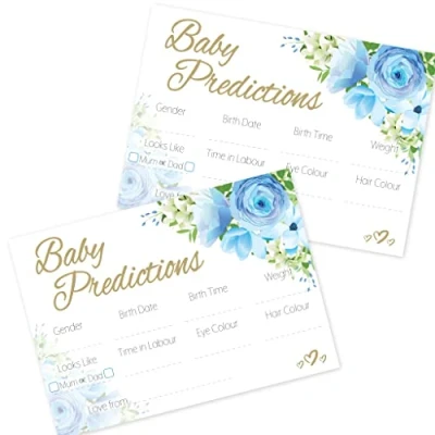 🌸 LOVELY KEEPSAKE ACTIVITY - Guests can share their predictions for baby during the baby shower. Collect the cards and store them in an envelope or box (not included). After the baby is born, the mother can open the envelope/box and enjoy reading through them. These charming cards make a special keepsake for the new mum. 🌸 A PERFECT SIZE - These delightful cards are size A6 (measuring 10.5 x 14.8 cm / 4.1 x 5.8") These are the perfect size for keeping in an album, memory box or scrap book. 🌸 10 CARDS INCLUDED - This pack includes 10 cards for guests to fill in ready for Mummy to enjoy later on.These make a wonderful keepsake for mummy!These make a wonderful keepsake for mummy!These make a wonderful keepsake for mummy! 🌸 READY TO USE - No set up is needed for this activity, simply hand out the cards to each guest or if you are in a restuarant lay one at each place setting then you are ready to go! 🌸 SUITABLE FOR BABY SHOWERS AND GENDER REVEALS - A perfect addition to your baby shower but also great for gender reveal parties. As these are sentimental cards to keep, they are not something you would want to do at both your Baby Shower and your Gender Reveal, we would recommend having them for one or the other. 🌸 BABY IN BLOOM THEME - Celebrate the beauty of new life with our elegant baby shower theme, Baby in Bloom! Featuring delicate blue flowers and lush green foliage adorned with elegant gold script, this theme embodies the joy and excitement of welcoming a new addition to your family. Bring a touch of sophistication to your celebration with Baby in Bloom. ❤️ 100% BRITISH MANUFACTURED - We source all of our materials from paper to package, here on our sunny little island Great Britain. Shop local & support British businesses!