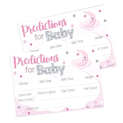 🌜 LOVELY KEEPSAKE ACTIVITY - Guests can share their predictions for baby during the baby shower. Collect the cards and store them in an envelope or box (not included). After the baby is born, the mother can open the envelope/box and enjoy reading through them. These charming cards make a special keepsake for the new mum. 🌜 A PERFECT SIZE - These delightful cards are size A6 (measuring 10.5 x 14.8 cm / 4.1 x 5.8") These are the perfect size for keeping in an album, memory box or scrap book. 🌜 20 CARDS INCLUDED - This pack includes 20 cards for guests to fill in ready for Mummy to enjoy later on.These make a wonderful keepsake for mummy!These make a wonderful keepsake for mummy! 🌜 READY TO USE - No set up is needed for this activity, simply hand out the cards to each guest or if you are in a restuarant lay one at each place setting then you are ready to go! 🌜 SUITABLE FOR BABY SHOWERS AND GENDER REVEALS - A perfect addition to your baby shower but also great for gender reveal parties. As these are sentimental cards to keep, they are not something you would want to do at both your Baby Shower and your Gender Reveal, we would recommend having them for one or the other. 🌜 OVER THE MOON THEME - Transform your baby shower into a dreamy celebration with our 'Over the Moon' range! Featuring a serene sleepy moon on a cloud with shimmering silver stars, in delicate pastel baby pink and white hues. This charming collection is perfect for Over the Moon, Twinkle, Twinkle Little Star or Sweet Dreams theme Baby Showers ❤️ 100% BRITISH MANUFACTURED - We source all of our materials from paper to package, here on our sunny little island Great Britain. Shop local & support British businesses!, Manufacturer: Pink Bee Parties