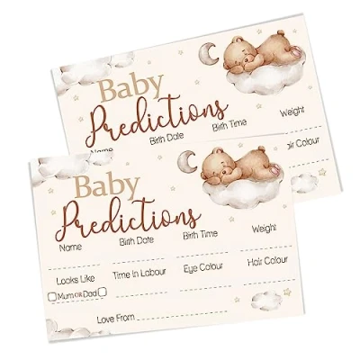 🧸 LOVELY KEEPSAKE ACTIVITY - Guests can share their predictions for baby during the baby shower. Collect the cards and store them in an envelope or box (not included). After the baby is born, the mother can open the envelope/box and enjoy reading through them. These charming cards make a special keepsake for the new mum. 🧸 A PERFECT SIZE - These delightful cards are size A6 (measuring 10.5 x 14.8 cm / 4.1 x 5.8") These are the perfect size for keeping in an album, memory box or scrap book. 🧸 10 CARDS INCLUDED - This pack includes 10 cards for guests to fill in ready for Mummy to enjoy later on. 🧸 READY TO USE - No set up is needed for this activity, simply hand out the cards to each guest or if you are in a restuarant lay one at each place setting then you are ready to go! 🧸 SUITABLE FOR BABY SHOWERS AND GENDER REVEALS - A perfect addition to your baby shower but also great for gender reveal parties. As these are sentimental cards to keep, they are not something you would want to do at both your Baby Shower and your Gender Reveal, we would recommend having them for one or the other. 🧸 TEDDY BEAR THEMED - This baby shower game boasts a cute teddy bear design that will make your heart melt. The theme features a sleepy bear floating on a cloud, with a color scheme of beige, cream, and brown, perfect for your Teddy themed Baby Shower! ❤️ 100% BRITISH MANUFACTURED - We source all of our materials from paper to package, here on our sunny little island Great Britain. Shop local & support British businesses!, Manufacturer: Pink Bee Parties