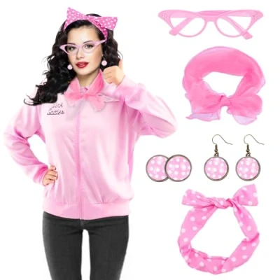Pink Ladies Jacket, Fancy Dress for Adults, Lady Grease Costume 1950s Accessories Women, Cat Eye Glasses, Polka Dot Headband, Silk Scarf Earrings, World Book Day Costumes Adults