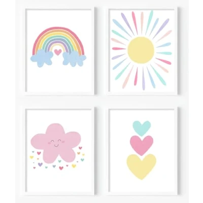 Pink Nursery Wall Art Prints Baby Girl Canvas Rainbow Pastel Decor Boho Cloud Colorful Sunshine Hearts for Toddler Girls Kids Room Decor,Set of 4(8x10inch,Unframed).