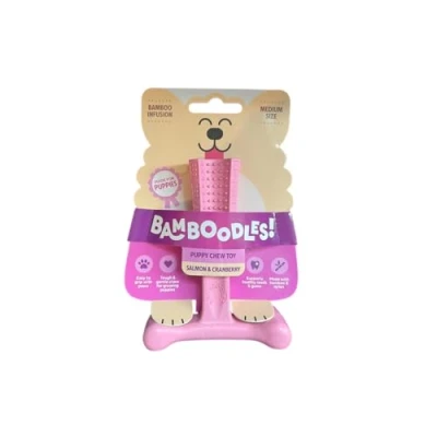 FLAVOURFUL CHEWING FUN: Bursting with tasty Salmon and Cranberry flavour, this dog chew toy makes chewing a joy. It satisfies natural instincts while helping your dog feel calm and focused during downtime, training, or when you’re away. SAFE & TOUGH MATERIALS: Crafted with natural bamboo fibre and durable nylon, this chew withstands repeated use while staying gentle on teeth and gums. Great for regular chewers who need a non-edible toy that lasts. DENTAL SUPPORT BUILT-IN: The textured surface gently scrapes away plaque and tartar, promoting fresher breath and cleaner teeth. A simple, tasty way to improve your dog’s oral hygiene every day. SHAPE DOGS CAN HOLD: Designed for paw control, this chew toy makes it easy for dogs to settle down and gnaw comfortably. Whether they’re lying on the sofa or out in the garden, it’s a stable, grippable shape they’ll love. PERFECT FOR SMALL DOGS: This size is great for puppies. The tasty Salmon and Cranberry flavour, firm texture, and grippable shape make it a go-to chew for everyday satisfaction.
