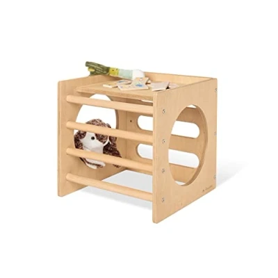 Pinolino "Kari" climbing cube according to Pikler with dimensions: W 46 x D 46 x H 46 cm with non-slip base and maximum load of 50 kg. Material made from 18 mm birch plywood and 30 mm beech rungs. Assembly required The motor skills toy made of solid wood has a non-slip finish and is therefore particularly safe when the little ones climb and play on it. The cube can hold up to 50 kg and recommended for children aged 2 and above The FSC mix certified (FSC-C120795) climbing cube can be used not only as a climbing cube thanks to its grooves, but also as a tunnel, rung side and ladder side The climbing cube is another element in the climbing world 'Kari' and complements the additional items of the climbing world. This consists of a balance board, a climbing triangle, a climbing board and a climbing arch Pinolino has been fulfilling children's dreams since 1997, distributing children's furniture, accessories and toys. The German company only uses paints, glazes and oils suitable for children and offers many FSC-certified products, Manufacturer: Pinolino