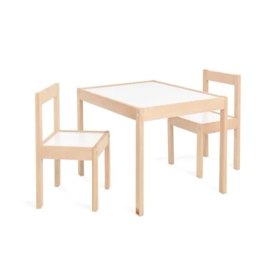 Partly solid: pine, clear lacquered and wood effect, plain white Recommended for children between 2 - 7 years It comes with 2 chair and 1 table Seat height 28 cm Table measures 64 cm length x 50 cm width x 46 cm height. Chair measures 28 cm width x 51 cm height x 30 cm depth.