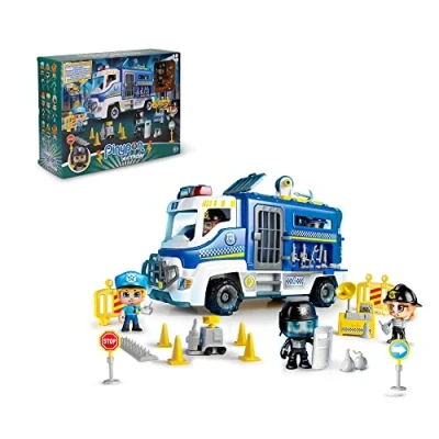 Pinypon Action vehicle, full of accessories and with police to recreate countless police scenes; box is openable and includes a Pinypon action figure and accessories Drive cops in the tricky police actions with the police van; with a large container to store the figures and pieces Stage set right to help develop imagination Action-packed truck for hours of fun: jail with enough room for 2 thieves, cabin where two cops can go ready to take action, hidden drawer in base to store all accessories It has a harpoon rope with pulley system, and multiple accessories: 2 fences, 4 cones, 2 traffic signs, bomb deactivator robot, dynamite, control computer, drone with remote and spiked trap for police control, Manufacturer: Famosa