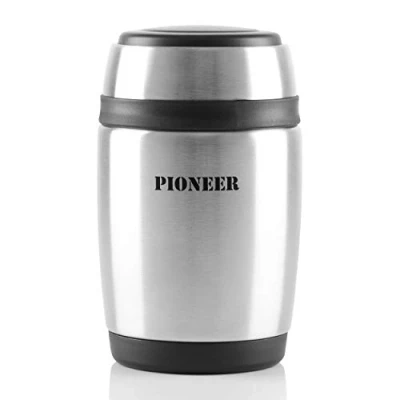 Double Wall Vacuum Food Flask High Grade 18/8 Stainless Steel Part of the Pioneer Range from GrunwergIdeal for hot or cold food Foldable spoon that fits inside the lid