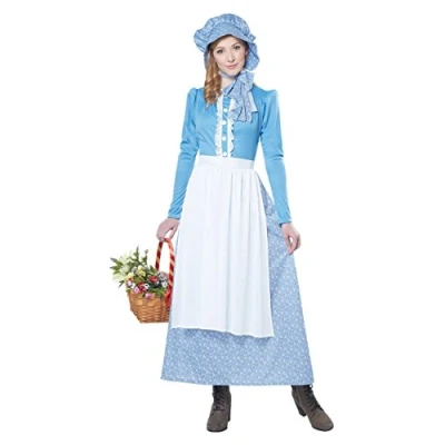 Long dress with decorative buttons and attached apron Bonnet cap with tie Boots and basket with flowers not included, Manufacturer: California Costumes