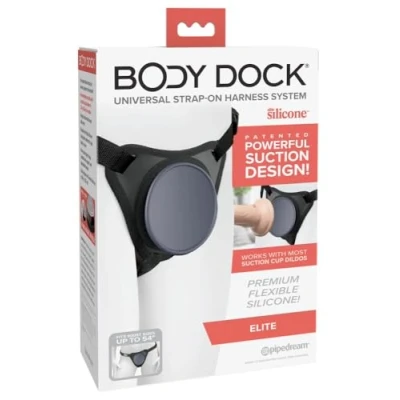 Body Dock Strap-On Harness Suitable for all dildos with a suction cup diameter of 8.6 cm (3.4 inches) or smaller Angled suction cup helps keep the dildo upright Heavy duty nylon straps and quick release buckles