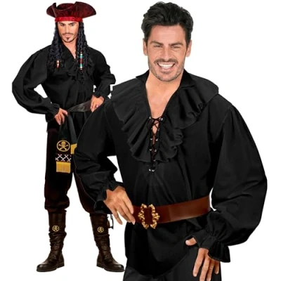 Would you like to show up as a dreaded pirate at carnival or at the next pirate party, but still set fashionable accents? Then this blouse that attracts attention with wonderful ruffles is the right garment for you The ruffles trump on the sleeve ends and collar of the pirate blouse for women Box contents: 1 x blouse with ruffles and lacing at the front. Colour: black. Size: XL Material: 100% polyester, Manufacturer: Widmann S.r.l.