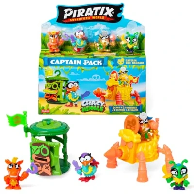PIRATIX ADVENTURE WORLD Crazy Jungle Series Captain Pack Doc Bandaid: 4 Piratix, 1 golden Captain, neon accessories, Cage, Cannon, 2 treasures, flags. out of 10