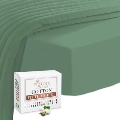 Pizuna 100% Cotton Double Fitted Sheet Hedge Green, 400 Thread Count Long Staple Bed Sheets 140x200 cm, Sateen Weave 40 cm Deep for 1 PC Green