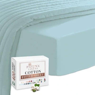 Pizuna 100% Cotton King Size Fitted Sheets Baby Blue, 400 Thread Count Long Staple Kingsize Bed 150x200 cm, Sateen Weave 40 cm Deep Sheet 1 PC