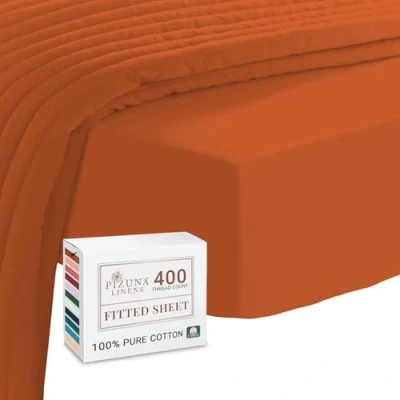 Pizuna 100% Cotton King Size Fitted Sheets Burnt Orange, 400 Thread Count Long Staple Kingsize Bed 150x200 cm, Sateen Weave 40 cm Deep Sheet 1 PC