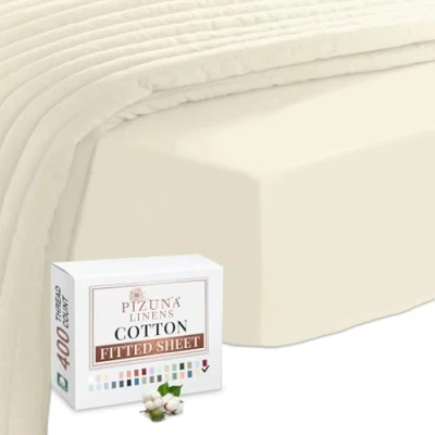 Pizuna 100% Cotton Super King Fitted Sheet Ivory, 400 Thread Count Long Staple 180x200 cm, Sateen Weave Superking Extra Deep 40 cm Fit 1 PC