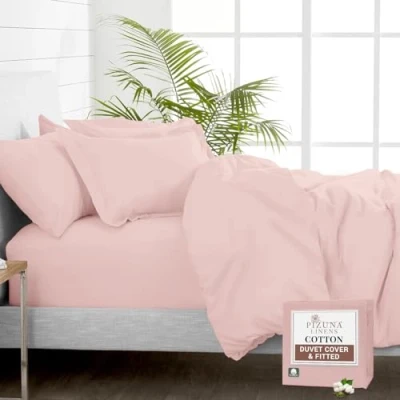 Pizuna Pure 100% Cotton Double Duvet Cover Set with Fitted Sheet Light Pink, 400 Thread Count Long Staple Bedding Set, Soft Sateen Weave Quilt & 40 cm Deep Sheets