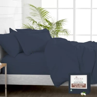 Pizuna Pure 100% Cotton Super King Duvet Cover with Fitted Sheet Dark Blue, 400 Thread Count Long Staple Bedding Set, Soft Sateen Weave Quilt Set & 40 cm Deep Sheets