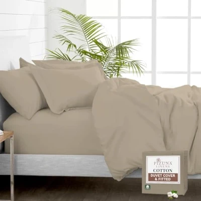 Pizuna Pure 100% Cotton Super King Duvet Cover with Fitted Sheet Simply Taupe, 400 Thread Count Long Staple Bedding Set, Soft Sateen Weave Quilt Set & 40 cm Deep Sheets
