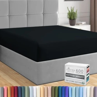 Pizuna Pure Combed Cotton Super King Fitted Sheet Black, 600 Thread Count 100% Long Staple 180x200 cm, Sateen Weave Extra Deep 40 cm Fit 1 PC