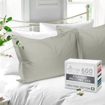 Pizuna Pure Cotton Standard Pillowcases 2 Pack Silver 50x75cm, 600 Thread Count Long Staple Combed Crisp Pillow Cover, Soft Sateen Oxford Cases (Cooling Pillowcase)