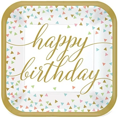 Package includes 18 Paper plates Have a colorful themed birthday meal with these Square Paper Plates Colorful ConfettiNone These paper plates are square with soft edges that features a golden Nonehappy birthdayNone headline surrounded with different light colored triangle confetti all inside a gold border Great for serving food for Birthday Celebrations This product has high quality prints and made of paper that measures at 25cm, Manufacturer: Amscan