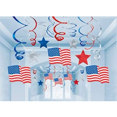 Package includes: 30 x Hanging decors (swirls only 45cm; swirls with cutouts 60cm) Product features stars, USA Flag cutouts and multicoloured foil swirls so it twinkles when struck by light. They arrive ready to hang. Ideal for celebrations like the 4th of July and many other American events. Made of foil and cardstock, Manufacturer: amscan