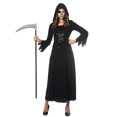 Package includes 1 pc of Female Grim Reaper Costume Adults -Size 12-14 This Female Grim Reaper Costume for Adults is a long black hooded dress with tattered long sleeves, and black ribbon in the front. Stand out in Halloween parties using this Female Grim Reaper Costume for Adults. Let everyone know that the night is yours, get ready to take lives as you become Death itself. A Perfect Choice for role playing, halloween parties, masquerades, variety of events, costume party accessories, and as a perfect complement for your costume. Our Female Grim Reaper Costume for Adults uses Polyester for a lightweight and durable costume that you can reuse., Manufacturer: amscan