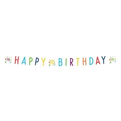 Colourful, vibrant and fun! Our confetti party range is sure to make your celebration POP! Letter banner with a 'Happy Birthday! 70' message and finished with a rainbow confetti print. Length: 1.8m Great for walls, windows, or doorways. Material: Paper, Manufacturer: Amscan International Ltd