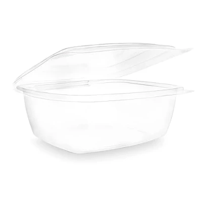 Rectangular Hinged Deli Containers. Strong and Light. ideal for eco presentation for deli treats and salads. Made from PLA, a renewable alternative to plastic. Clear for visibility. Contains 200