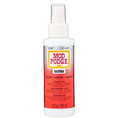 Mod Podge Ultra Gloss is a spray-on all-in-one glue and sealer with a super strong formula designed for both indoor and outdoor use. The 4 oz bottle is perfect for small projects and detail work, providing a smooth glossy finish with no brush strokes.. This water-based, non-toxic formula is UV-protected, scratch- and water-resistant, and self-levelling for an even coat that dries fast. It adheres securely to a wide range of surfaces including wood, ceramic, fabric, canvas, and sculptures, and has high adhesion for holding glitter firmly in place.. Features & Benefits. Spray-On Formula – Easy application with no brush marks.. Glossy Finish – Dries clear with a polished shine.. Durable Protection – Scratch- and water-resistant with UV shielding.. Multi-Surface Use – Works on wood, ceramic, canvas, fabric, and more.. Self-Levelling & Quick-Drying – Smooth, even coat that dries fast.. Compact Size – 4 oz bottle ideal for small projects and detail work.. Inspiration. Use Ultra Gloss to add a polished protective coat to small crafts, decorative accents, or detailed projects where a spray finish ensures smooth, even coverage.. Product Details. Size: 4 oz. MPN: CS44636